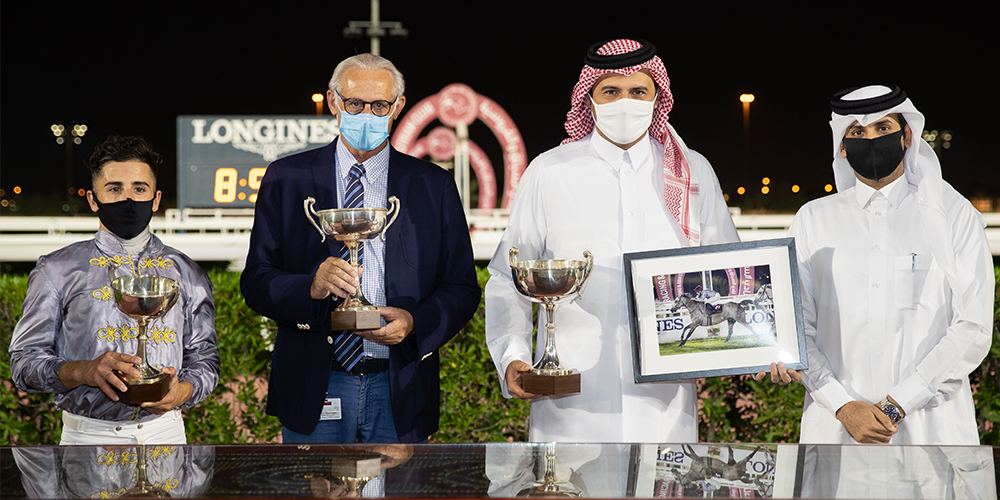 Abdulhadi Mana Al Hajri’s DOMINUS (Zoffany x Gwen Lady Byron) has formed quite a partnership with jockey Luca Maniezzi winning for the second time in 2020, besides a runner up finish on their last outing together. On Thursday, in the THOROUGHBRED CONDITIONS (Class 2), the penultimate race on the card, Stefano Ibido schooled colt took a comfortable one and a half length victory in the seven furlong run on turf, the 4yo’s fifth win overall.