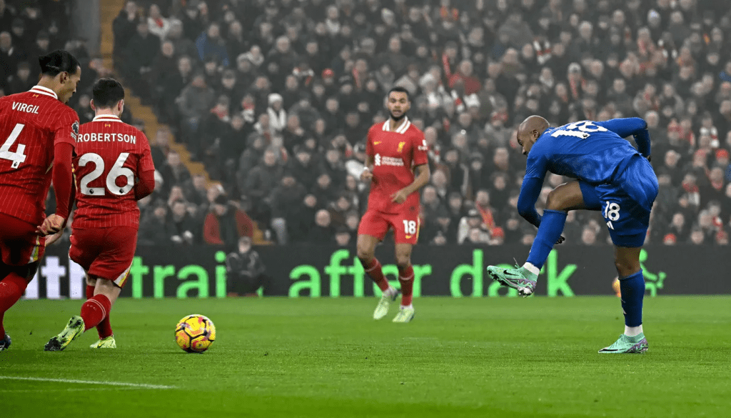 Leicester were first to silence Anfield crowd on a slick Liverpool evening when Stephy Mavididi’s run from left ended in a corner to Ayew who pulled the pin with his strength, over Andy Robertson and round him to volley.