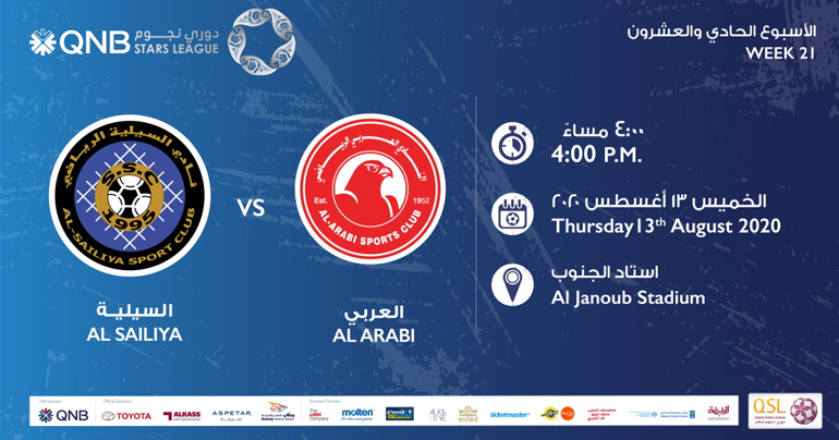 Al Sailiya face Al Arabi in Week 21 of the 2019-20 QNB Stars League. The kick-off is at 16:00 at the Al Janoub Stadium on Thurday, 13th August, 2020.