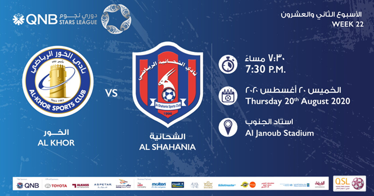 Al Khor face Al Shahania in Week 22 of the 2019-20 QNB Stars League. The kick-off is at 19:30 at the Al Janoub Stadium on Thursday, 20th August, 2020.